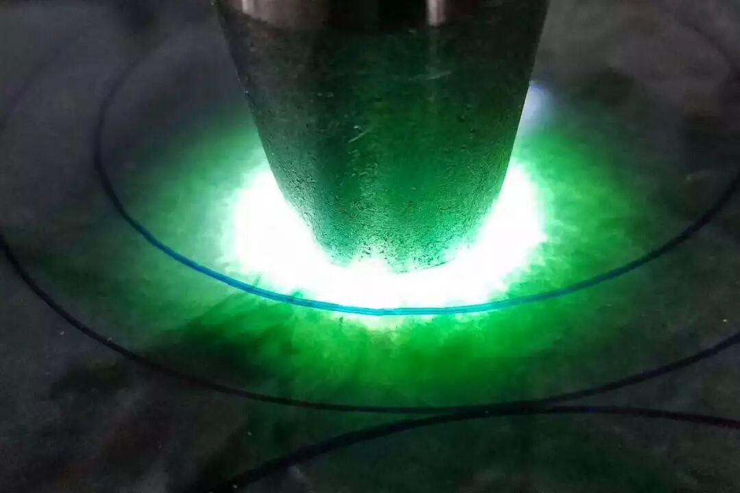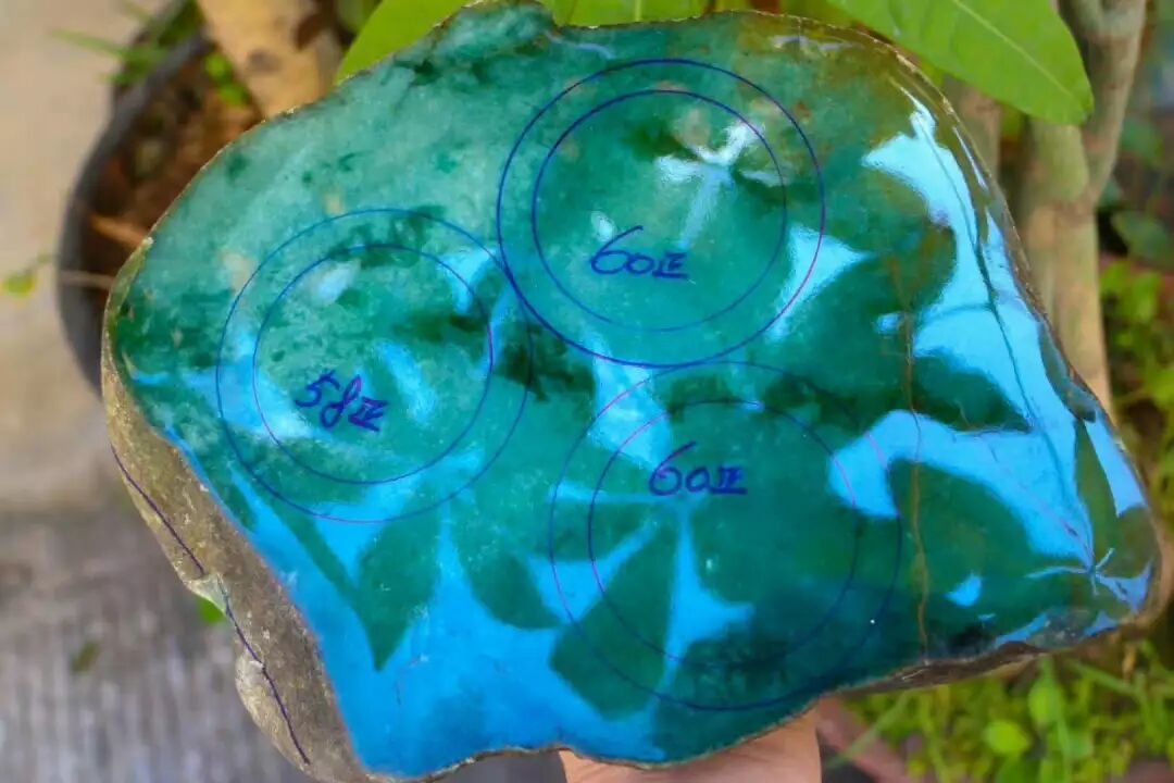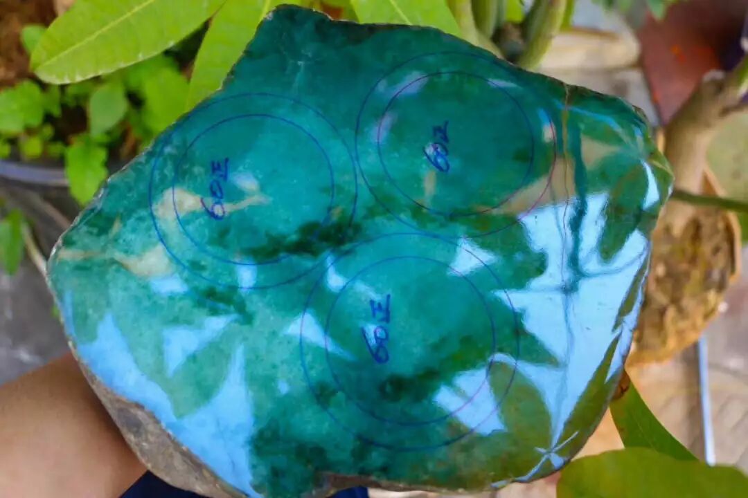 打灯看到的颜色绿油油的,这色泽的确让人羡慕嫉妒,现在就开切剩下的厚度,直接拿给师傅切,顺便也把手镯成品做出来,能出几个出就出几个吧,反正剩下的边角料可以做挂件和牌子,都很漂亮。
