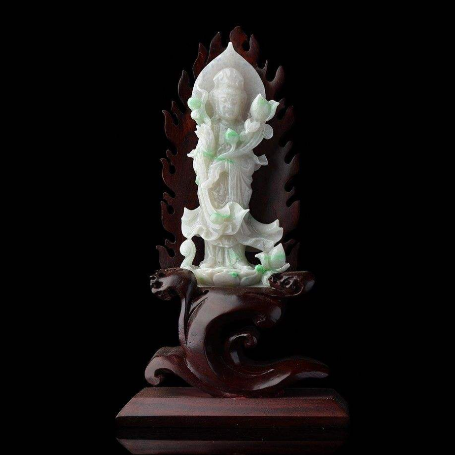 观音是温和慈悲的,家庭里摆放翡翠观音摆件是为了修身养性,陶冶情操。观音谐音官印,寓意仕途顺利,而且信佛的国人很多的,因此翡翠观音摆件也是比较受欢迎的。