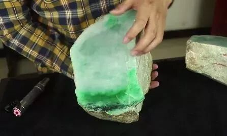 切开以后这个石头颜色非常的好,也化得非常的好,龙到处有水,在这个老场口上体现的非常的好,这个场口是百三桥场口的,我们仔细看下场口的皮相、砂感,老度非常的好,这种老场口,赌这种色料的机会会大很多很多,石头上有一边是一包癣,然后也有“蟒”,沿着蟒下去的带子化水了,种底是糯化底。