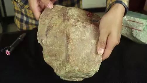 我们先来分析一下这块石头在没切之前的表现,这个石头的这边是先天的断口区域,有风化成皮壳的一种表现,有一条带子,是这个石头最大的看点,也是最大的赌点,缅甸的商家赌石喜欢从中间直接来一刀,使石头感觉上比较明朗。