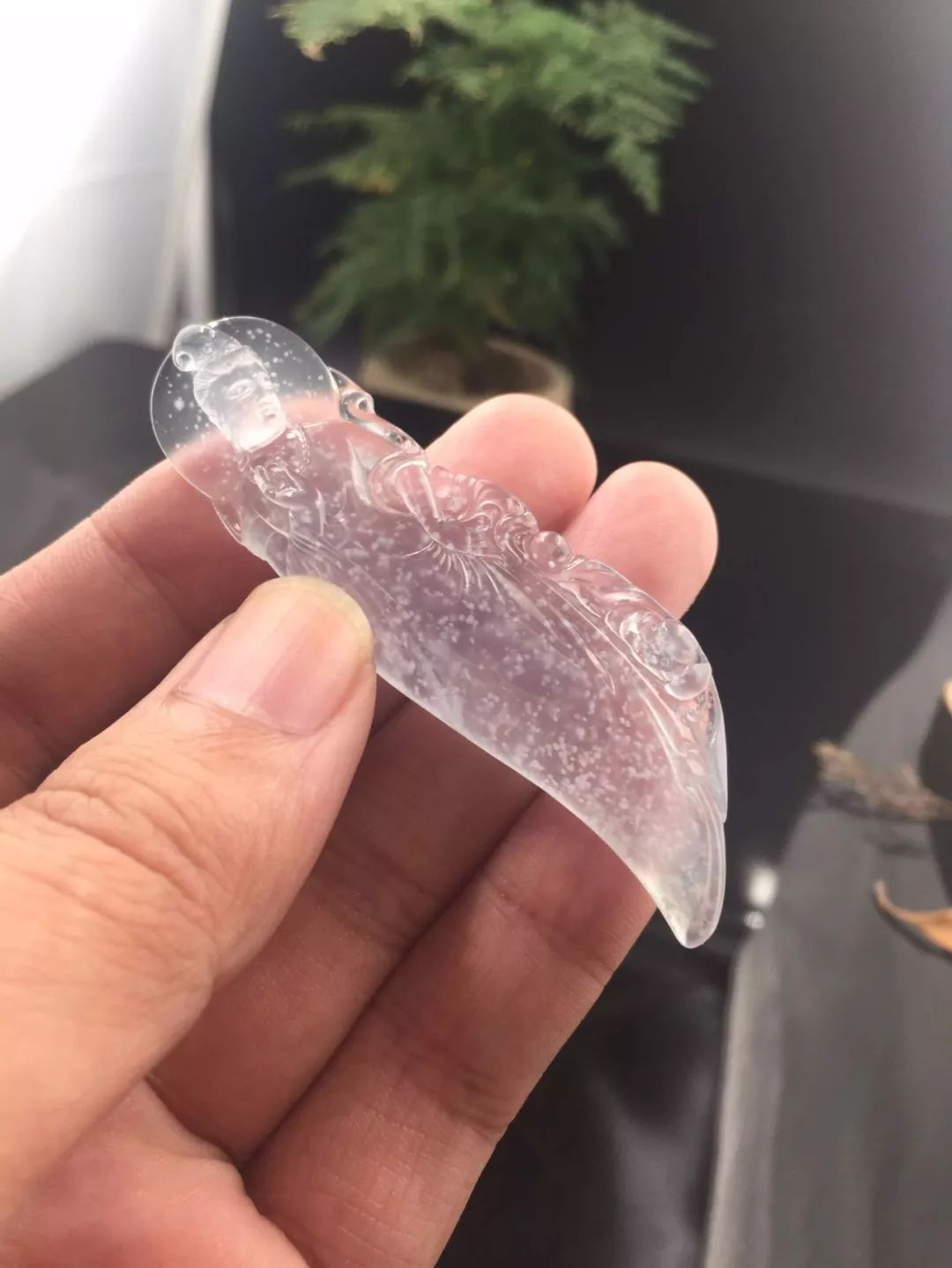 今天小编给大家分享的是一块玻璃种雪花棉的挂件料,其他品质的翡翠有雪花棉都是降低品质,属于不好的标志,而玻璃种就很例外。雪花棉的美感、韵味和意境都可以在其中完美的体现出来。
