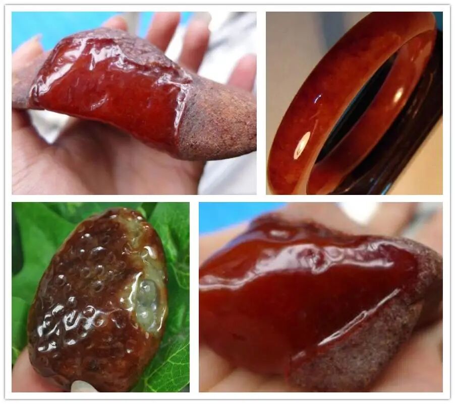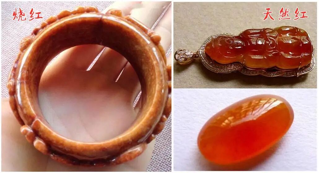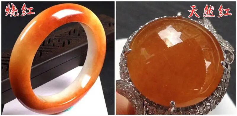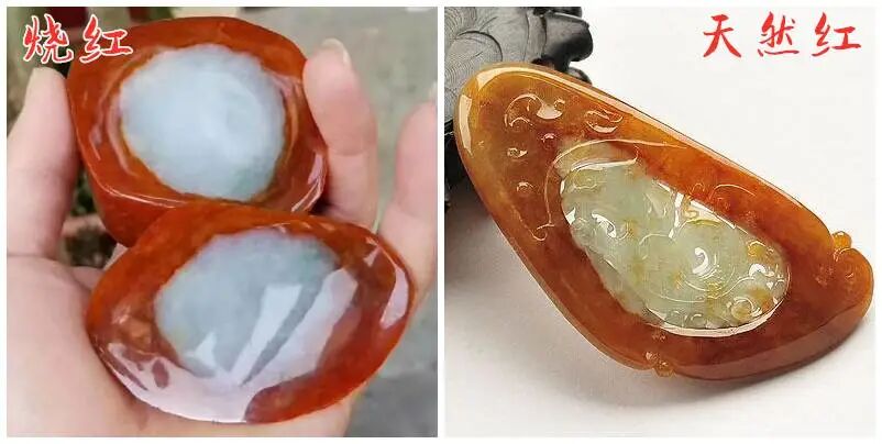在横截面上观察会发现烧红没有颜色由深到浅的过渡带,烧红的色是直接从深色到翡翠的底色的,而天然红则反之,有不规则的过渡带。