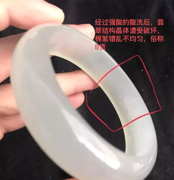 1:自然光识别法:“翡翠”的成色、水头、冰裂纹、黑点都可以看出,如果被强酸酸洗过的“翡翠”可以看到它的外表会有明显的网纹状,同时也呈现出不均匀的颗粒感,凹凸不平的感觉就可以断定为B货。