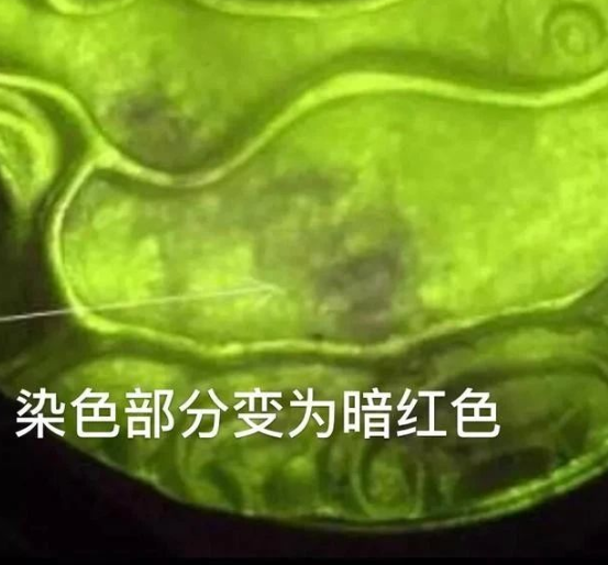 4:查尔斯滤镜识别法:经过酸洗注胶的翡翠,在查尔斯滤镜下会呈现紫红、暗红或红色时就可以断定它是赝品。