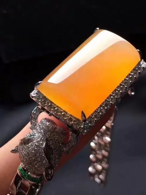 优质的黄翡翠可以呈现金黄色或蜜糖色,色泽均匀透亮,其中以离子黄、鸡油黄或柠檬黄品质最高,但是能够达到这种颜色的翡翠少之又少,特别是制成手镯的更是非常罕见,一般都属于翡翠中的上品。