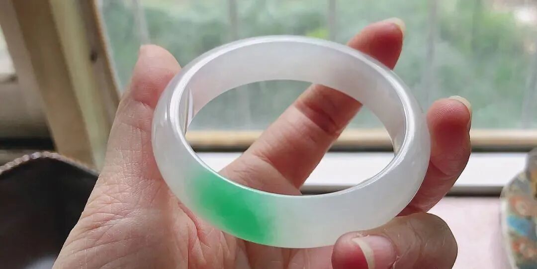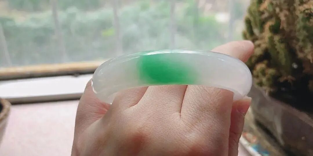 抛光后的成品手镯很美,质地细腻无纹裂,飘绿清新灵动,有种仙气飘飘的感觉,有人说漂亮得都有点像假的了。