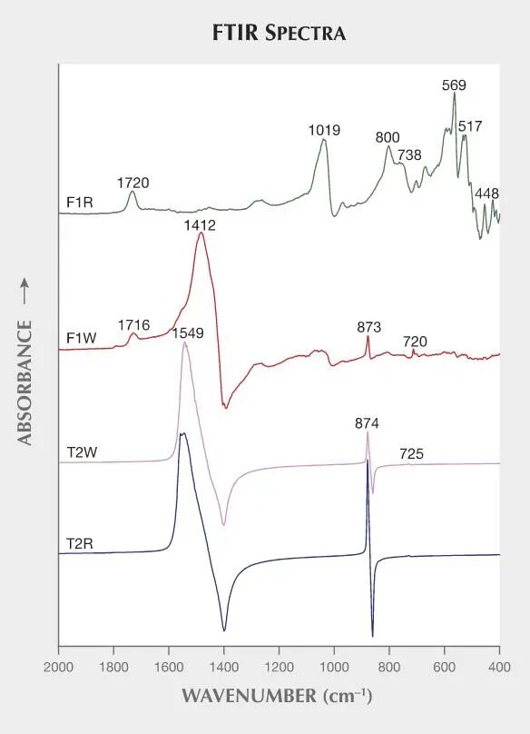图6 使用镜面反射法的样品红色和白色部分的傅里叶变换红外光谱(FTIR)。从上到下显示的是仿制品的红色和白色部分,以及菱锰矿的白色和红色部分。