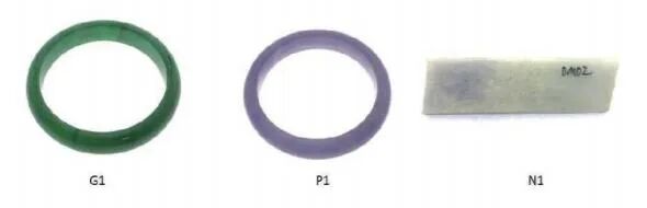 图8 G1与P1为B+C货翡翠手镯,N1为天然翡翠原料