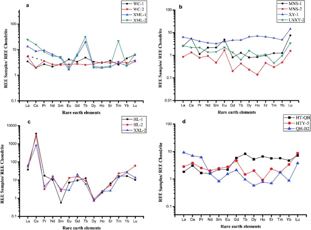 以软玉为例,斯琴毕力格等使用辉光放电质谱(GD-MS) 对14个软玉样品中的14种稀土元素La,Ce,Pr,Nd,Sm,Eu,Gd,Tb,Dy,Ho,Er,Tm,Yb和Lu进行分析,发现可以不同矿床下产生的软玉所含稀土元素及其含量不尽相同,这是由于其独特的地质环境造成的,通过这些特征元素我们能够区分这些来自特定地区的软玉。此外成矿类型不同,软玉所含元素也有所不同,一般而言,白云石大理岩成因的软玉(D型)Fe、Cr、Co 及 Ni 等元素含量较低,而蛇纹石成因的软玉(S 型)其 Fe、Cr、Co 及 Ni 等元素含量较高,通过这些特征元素的分析我们能够区分这些来自不同地区的软玉。