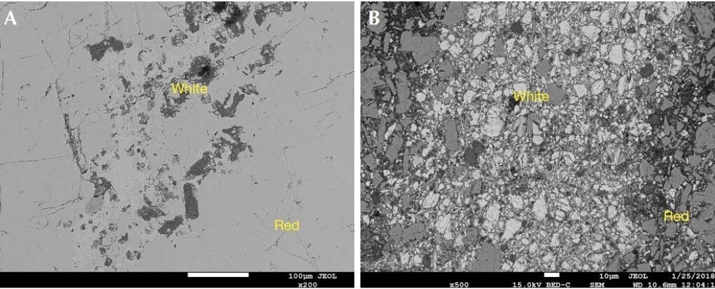 图5 样品的SEM图片。A.菱锰矿的红色和白色部分交界处 (放大倍率200);B:仿制品的红色和白色部分交界处(放大倍率500)