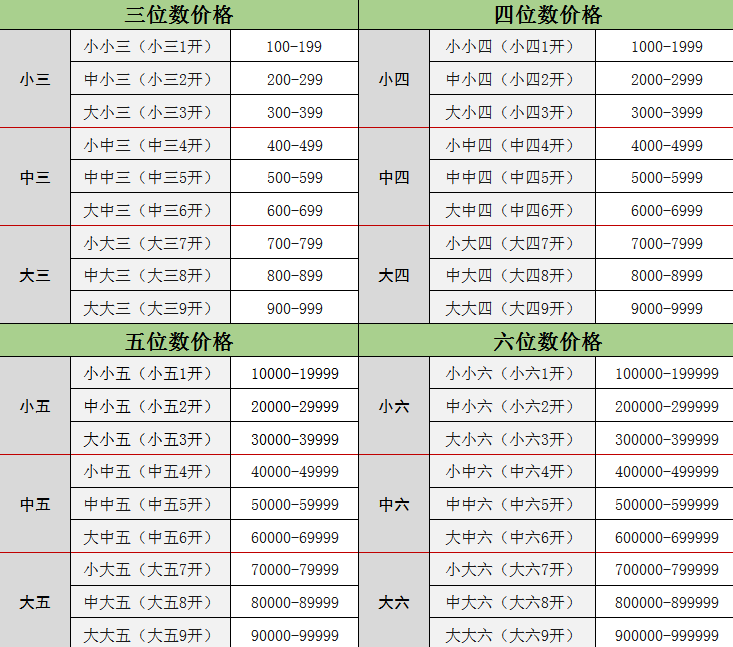 那么组合起来不难发现小三就是100—399,中四是4000—6900,大五是7000—9999.