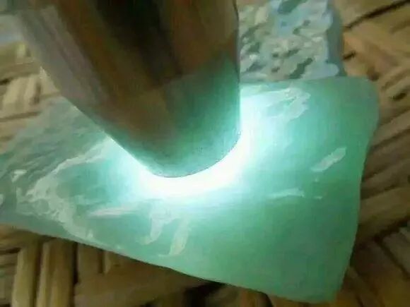 打灯看简直美炸了,光线能够进入肉质,就像一个小精灵要破壳而出的感觉,只有在翡翠原石种老、晶粒细小、结构紧密,底子纯净的情况下才能产生这样的表现