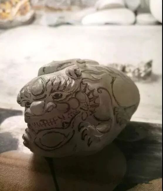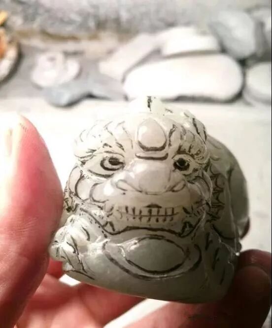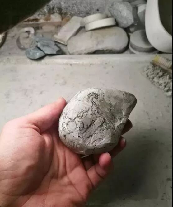 雕刻师傅已经在原石上画好了设计图,待会就按这个模型开始雕刻!