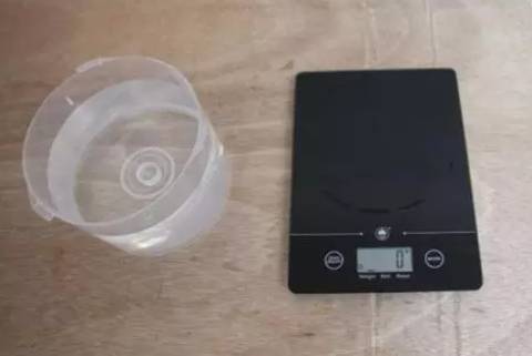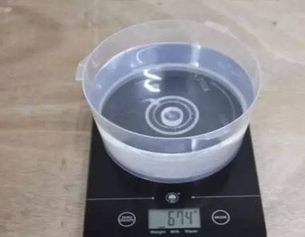 第二步,在容器中盛适量的水(有条件的最好选用蒸馏水,测试精度会更高,没有蒸馏水就用清水代替),然后称出重量,记录下来。