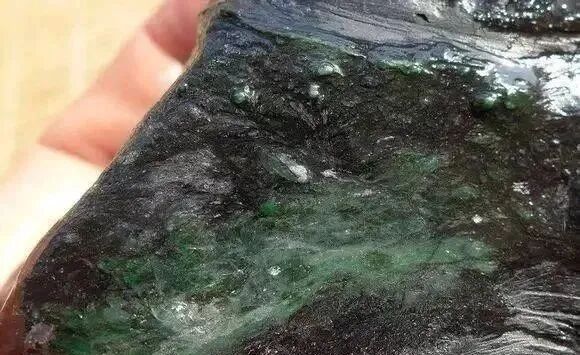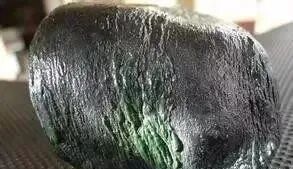 翡翠原石的绿色蟒带条多是翡翠在成岩期后改造的结果,成岩期后改造首先是在地球的应力作用下硬玉岩塑性变形、破裂,而后含致色离子的热液侵入,进行离子交代,形成绿色带条。