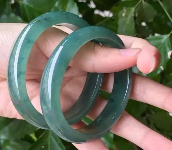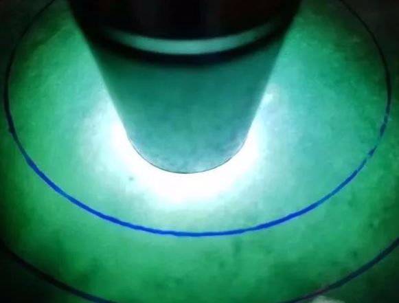 灯光下手镯圈口位置一片亮泽,幽幽蓝光,水润透亮,玉质细腻,稳妥化冰种水。