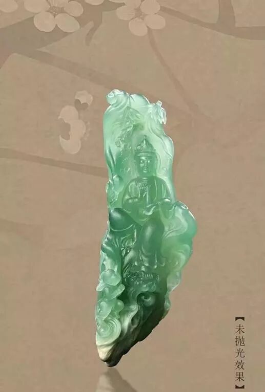 经过修整之后,看上去料子冰润细腻,淡晴水底,颜色上浅下深,它的缺点就是有几道裂,而且下面的裂较为颇深,总体来说呢,这块料子还算得上是比较完美,不知道雕刻师能给我们带来什么样的惊喜呢!