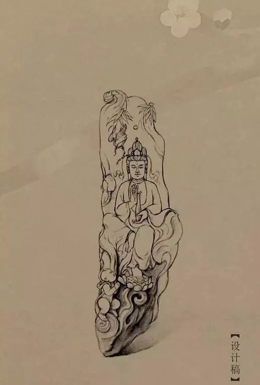 童子拜观音!设计稿上画着观音的手托着玉净瓶,左脚踏莲而坐,造型大方自然,能给人一种比较神秘的感觉,而这里面的寓意不说想必大家都知道了。