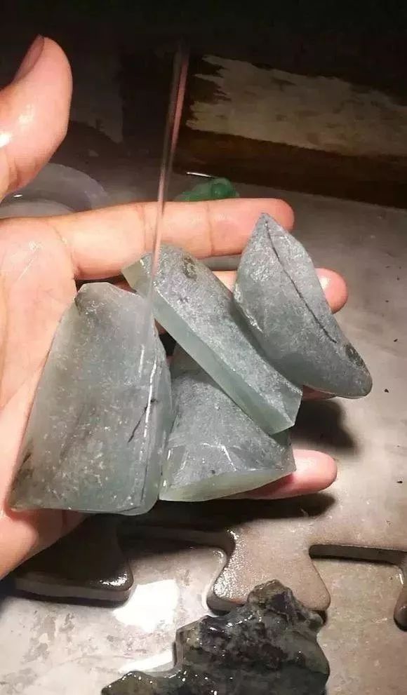 这是料子经过磨皮后,按大裂方向切开,可取的四块牌子料,好的东西都是需要一步一步来,不磨皮永远不知道里面裂的走向,这是我给石友们的一个建议。