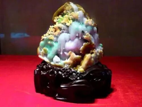 翡翠有五彩、六彩、七彩都可以称为“满堂彩”。摆件的体量大,五彩可见,六彩少见,最多可有七彩,但很少见;有七种颜色的翡翠,少见程度简直可以说是传说级的。