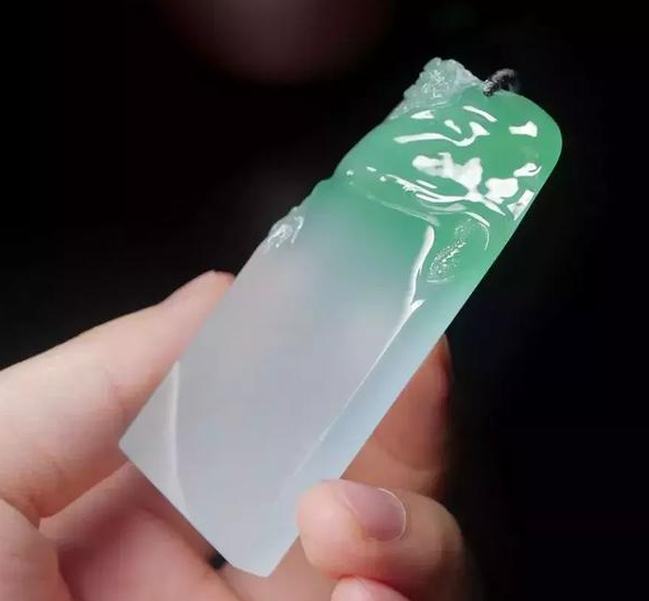颜色层次分明的冰种翡翠片料,龙牌挂件前有神龙后有佛陀,简约却不简单!