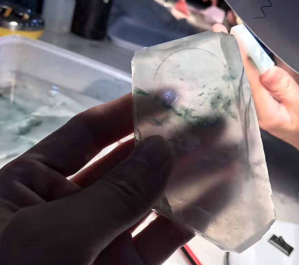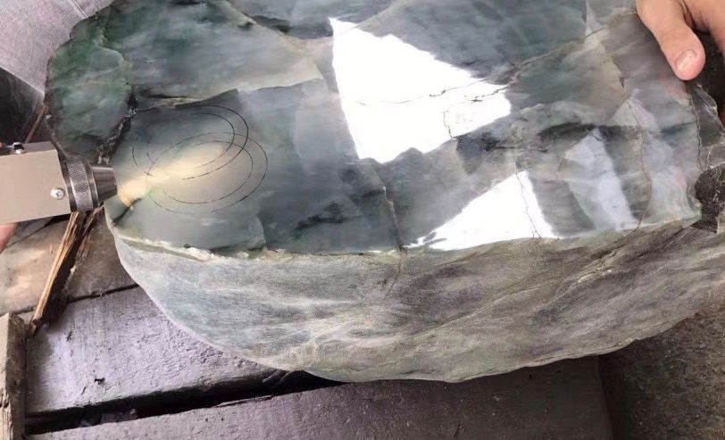 大家都知道一块原石必然首先考虑手镯。这种种水的料子,一旦能开到手镯,能带到飘花,单只价格肯定都是六位数不止的。不过很可惜,飘花的部分裂纹实在是太多了,无从下手啊,只找到这么一个位置,画好,做好标记。