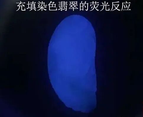 再看上文中的假翡翠在紫光灯下图片中的特点,是不是也在翡翠中零散的分布着星星点点的蓝白色荧光,在这里要提醒大家的是虽然荧光分布的少,但他还是假翡翠哦。所以大家只要记住在紫光灯的照射下能够呈现出蓝白色的荧光反应的就一定是假翡翠。
