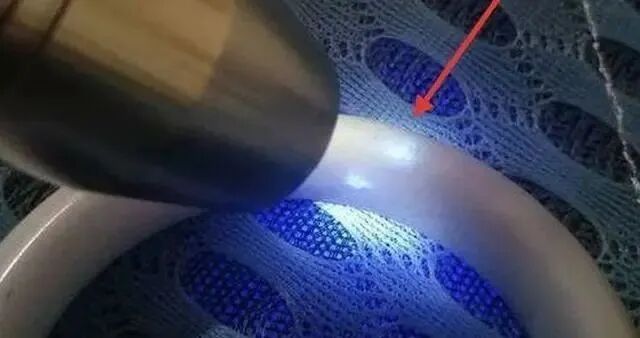 首先,大家先来看上文中的图片,你们看出了是有何特别之处吗?我可以先明确的告诉大家,上图是一张假翡翠在紫光灯下图片中所呈现出的特点图。是不是被紫光灯照射的地方会有白色荧光,这就是假翡翠的标志性鉴定特征。