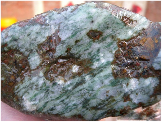 硬玉晶隙被次生的柯绿泥石充填所致。
