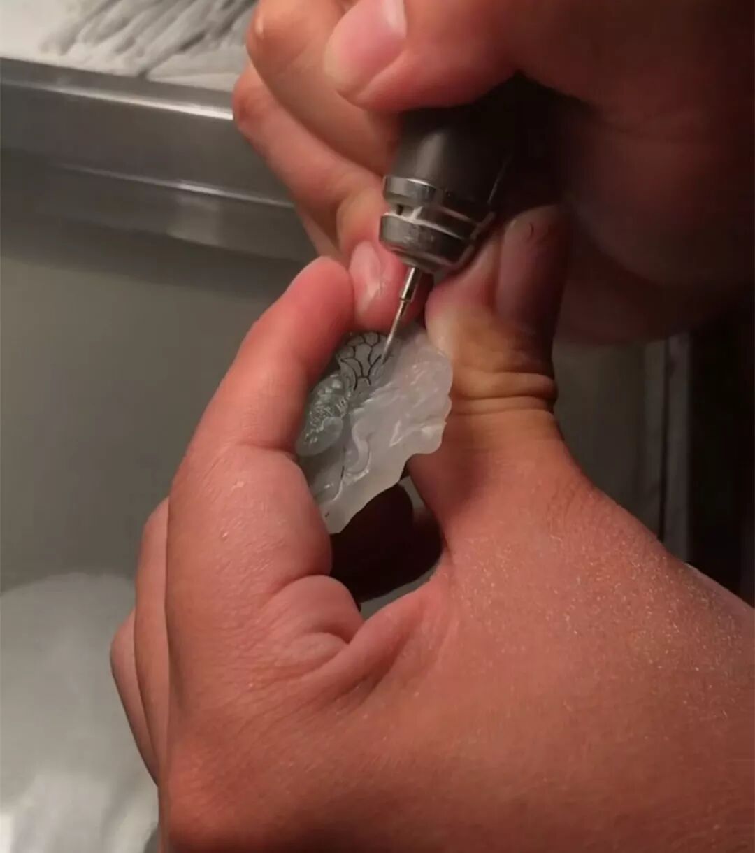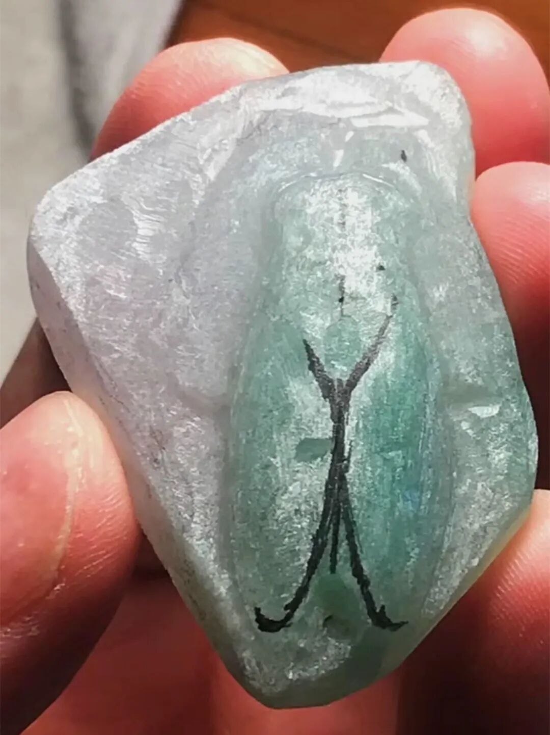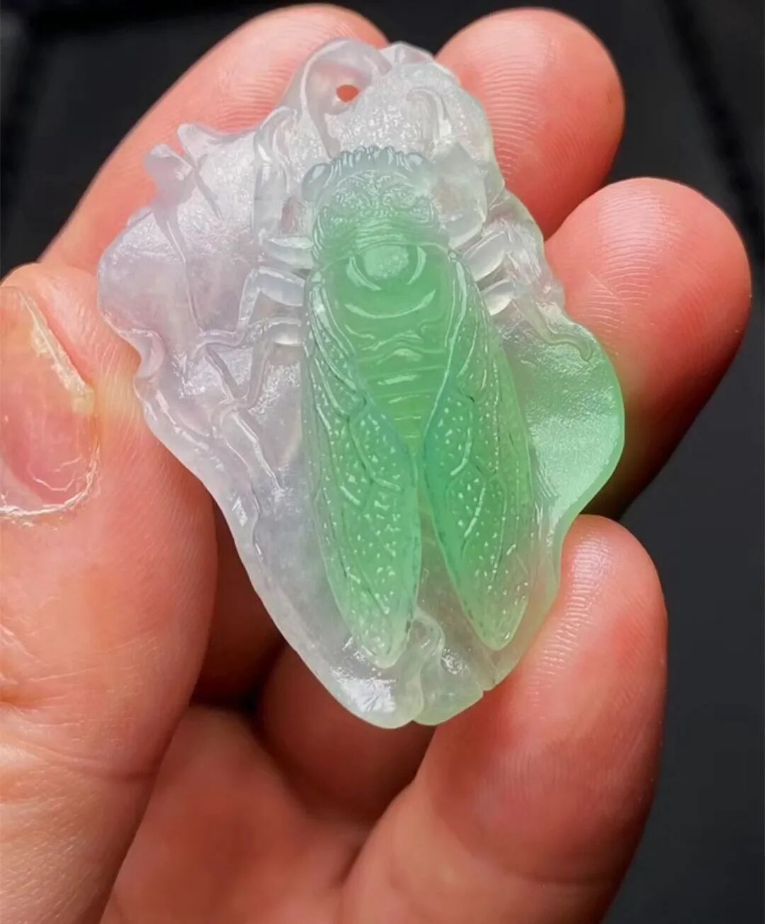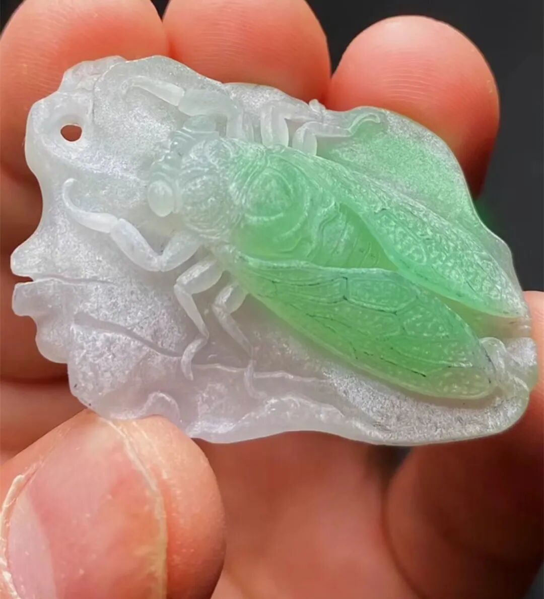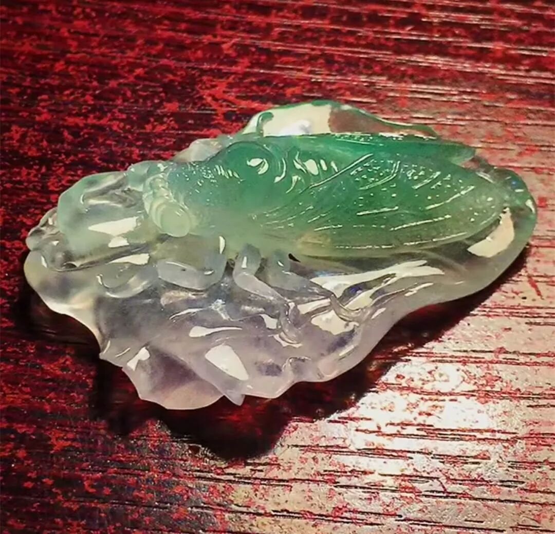 今天给大家分享的是一则带色翡翠片料雕刻一鸣惊人,蝉牌!这块片料很厚装,种特别的好,水头非常的通透,这块片料是有带色的,只是灯光下不太明显,片料上有些裂的地方要去掉,修整形状开始雕刻了!
