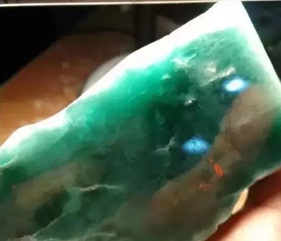 一刀切开,果然验证了买家独到的眼光,均匀的蓝调里泛着正气的阳绿,澄明透亮,高冰种水,切涨自然也不在话下了。