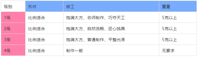在这个分级标准中“工”是指一件翡翠成品的形状、做工、重量3个方面,需要指出的是由于翡翠成品在设计师、工艺、文化内涵、制作年代、体量等方面的差异每件作品都有其自身的特点,详细的分级是无法做到的,大师佳作是为极品,适合珍藏升值;