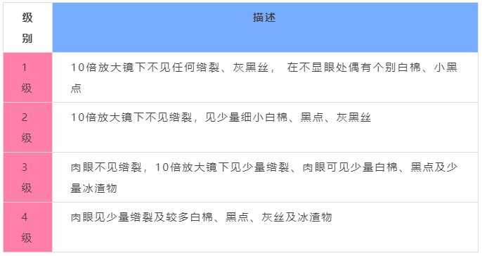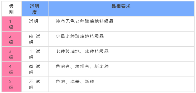 事实上,翡翠的结晶体颗粒大小和这些颗粒的交结关系是决定翡翠商业品种的主要原因,并由此制定出以下分级标准: