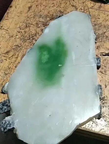 这个部分切开可以看到底色白度好,料子纯净度高、细度好,翠色浓郁,可以出一个手镯和几个玉牌。