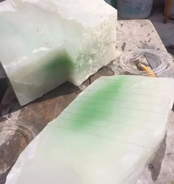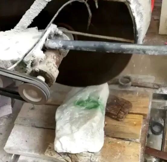 拿这块石头来说吧,切开一刀后翠色虽然很浓郁,底色白度也很好,但底下有绺裂较多、并且石性重……可谓是真正的“取其精华、去其糟粕”。