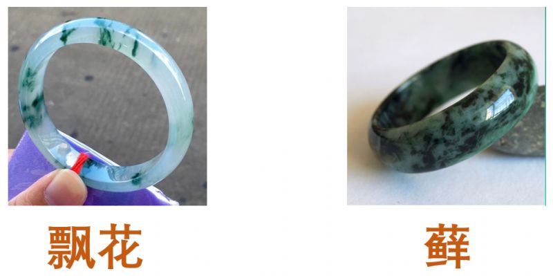 藓是呈黑色或者是黑灰色的条带或斑块,而飘花分别称为绿飘花和蓝飘花,翡翠是以绿色为主的玉石,绿色飘花的价值显然最高,蓝色飘花的价值次之。