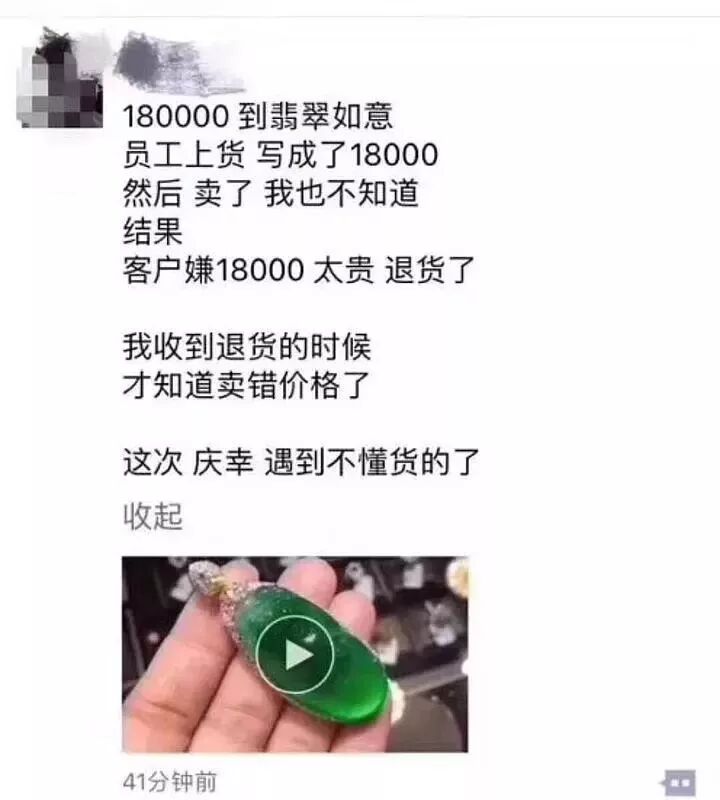 员工上货的时候把180000的翡翠如意写少一个0,以18000的价格卖了出去,商家本来还没发现,没想到那捡了漏的买家竟然嫌弃18000太贵退货了。
