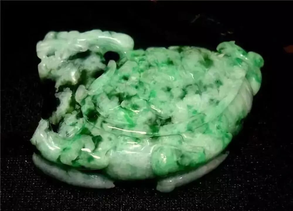 从名字就可以知道,这种翡翠的水头很差,看起来很干涩,透明度很低,质地也很粗糙,但是颜色非常浓烈,几乎是满绿。常见的干青种的颜色有黄绿、深绿和墨绿。干青种的翡翠一般都有黑色的杂质,有些是黑点,有些甚至是黑色的块状物。