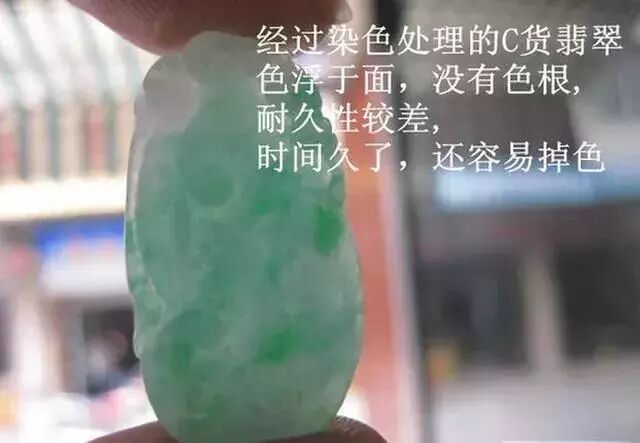 假货翡翠,由于经过了人工注色,因此,它的颜色是漂浮的、呆板的,不具有持久性,经不起日光的照射。
