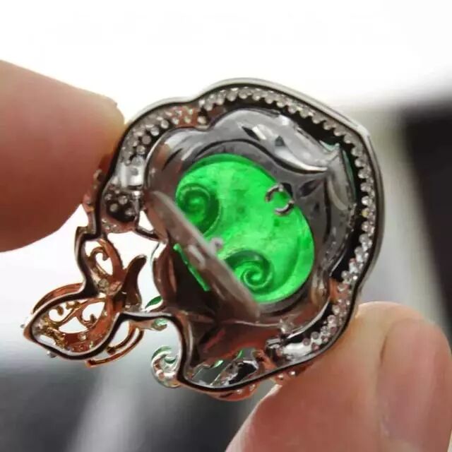 如果遇上镶嵌式翡翠的话,最好选择打开式托底的产品,然后我们可以从镶嵌托底中查看内部的翡翠是否实心。