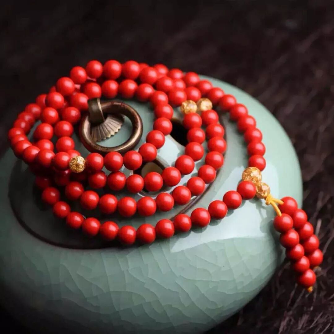 朱砂颜色喜庆,是中国人最喜欢的大红色,也是吉祥色。不同于其他玉石、天珠握在手里的冰凉感,朱砂握在手心里是温暖的,带有极强的磁场。它一直是民间公认的辟邪神物,体质虚弱的人可以佩戴朱砂来防身。