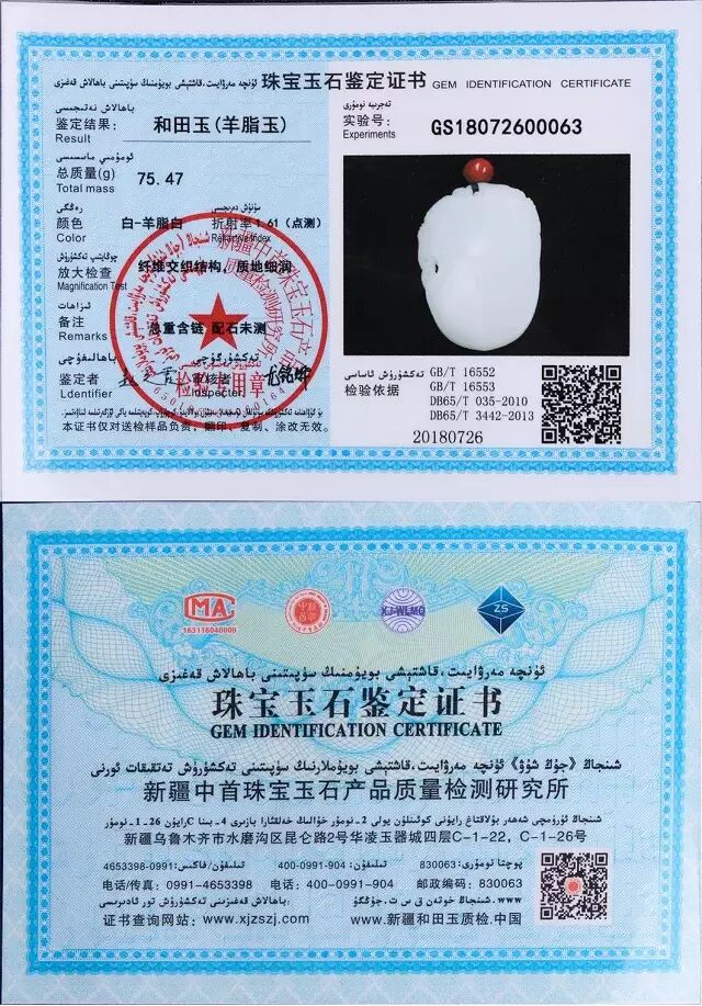 小编说:重申一次,一般国检、省检机构,出具的和田玉证书,只会标注“和田玉”,不会出现“羊脂”的字样,只有新疆的省级鉴定机构能出具羊脂玉的证书,是根据玉石的白度细度是否达到自定标准来评判的。如果对羊脂玉没有自信能够评判的话,证书不失为一种很好的保证。