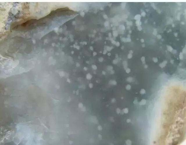 如果是次生矿物侵入愈合裂隙的话,就会看见点状的黑色物质,黑色区域较大的话,就称之为癣。