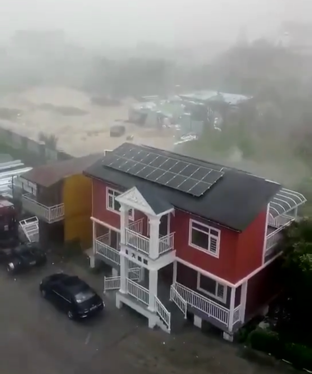 身后已水涝成河,风雨之中的轻钢房屋纹丝不动