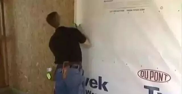 ▼接下来就是外墙处理了。外墙常用欧松板(OSB)用自攻自钻钉固定在龙骨上,白色材料俗称“呼吸纸”,属于防水透气层。