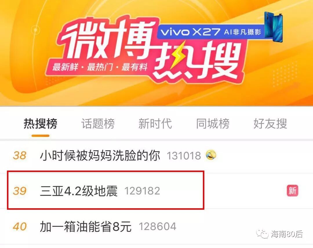 #三亚地震#话题迅速登上微博热搜