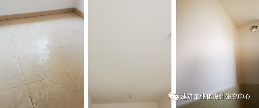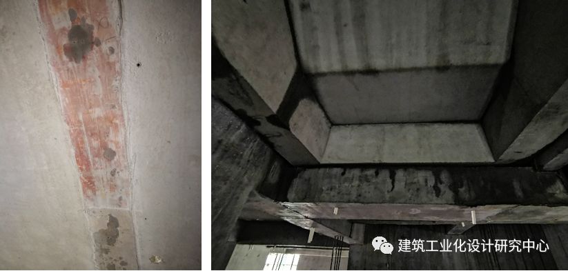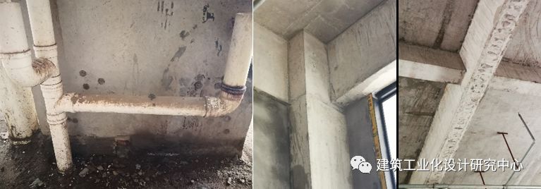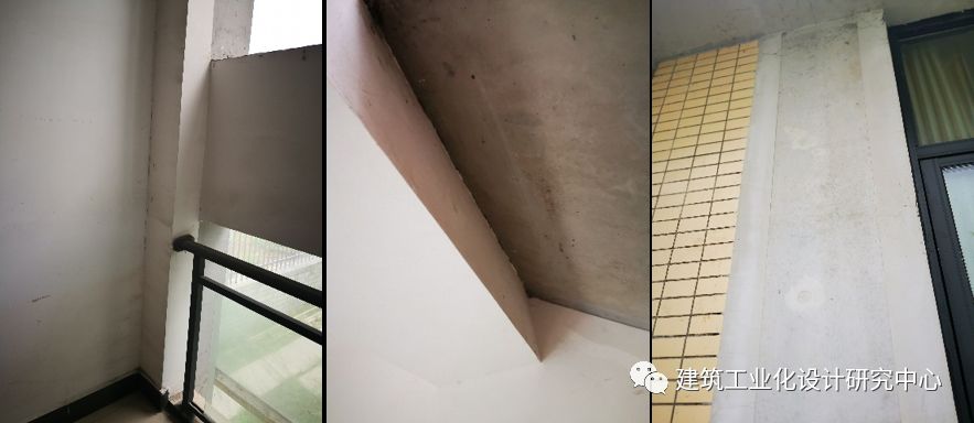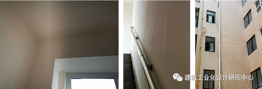 该项目为清水交付。调查组查看了12~14号楼1~3层所有房间,查看了楼面板、预制柱及柱脚节点、梁柱节点、主次梁及节点、楼梯间和隔墙面等部位,调查结果详图27~29。