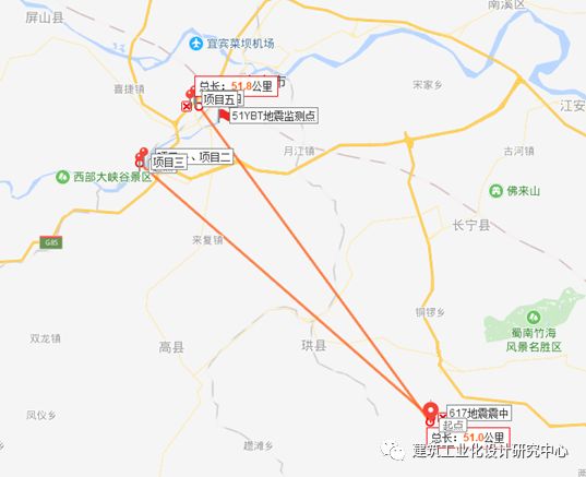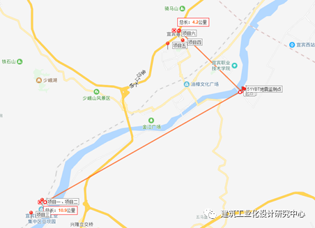 本次调查的装配式建筑均位于宜宾市叙州区,金沙江以北,距离震中50公里左右,该区域地震烈度接近6度。距离最近的地震地震监测站为“51YBT”监测站,该监测站距离项目一~三约11公里,距离项目四~六约4公里。本次调查项目、震中和地震地震监测站“51YBT”分布详图5和图6。