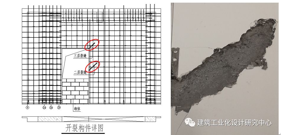 图16 保温砂浆开裂PC墙板立面示意、裂缝处剔开后现场图片