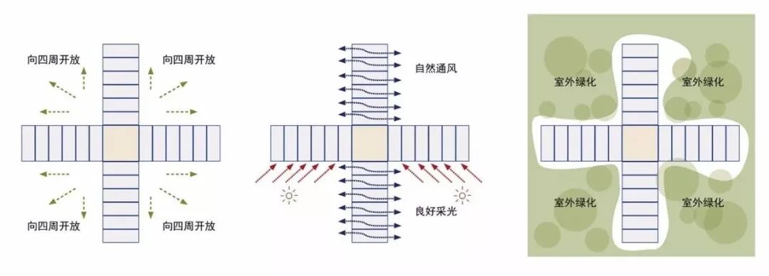 “十字”单元组合建筑向四周开放,有良好的采光与自然通风,并且最大化融于自然环境。